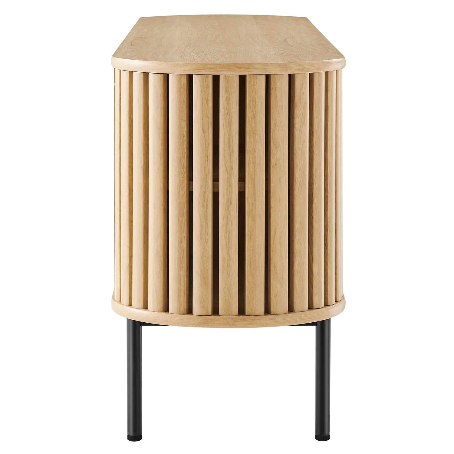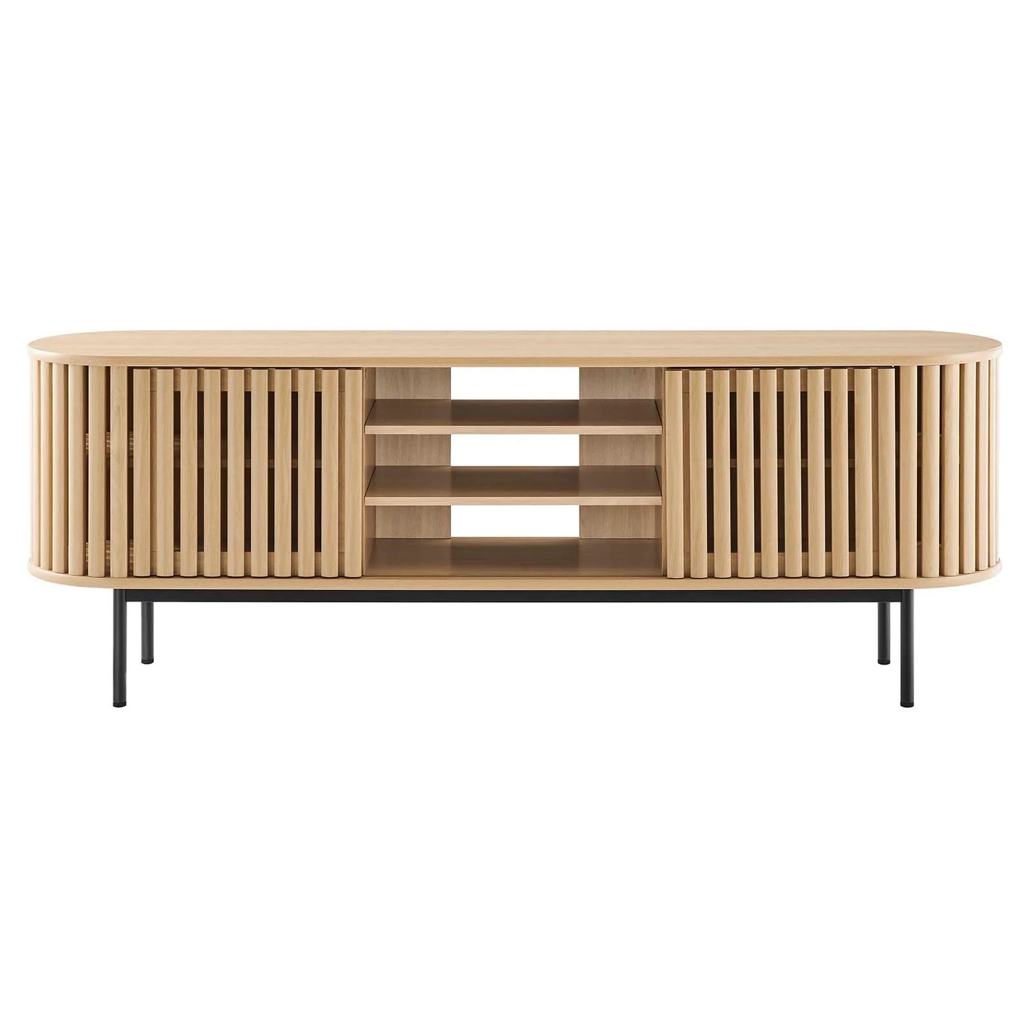 Adopte las líneas limpias y el estilo contemporáneo del soporte para TV Vivian de 71". Con una forma ovalada cautivadora, este soporte para TV aporta una estética moderna a cualquier habitación. El área de almacenamiento central abierta tiene capacidad para accesorios multimedia e incluye un respaldo abierto para una gestión perfecta de los cables. Dos estantes centrales ajustables permiten opciones de almacenamiento versátiles, mientras que dos puertas frontales corredizas con listones de madera ofrecen una apariencia única y atractiva.