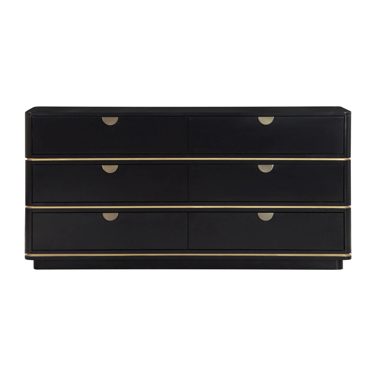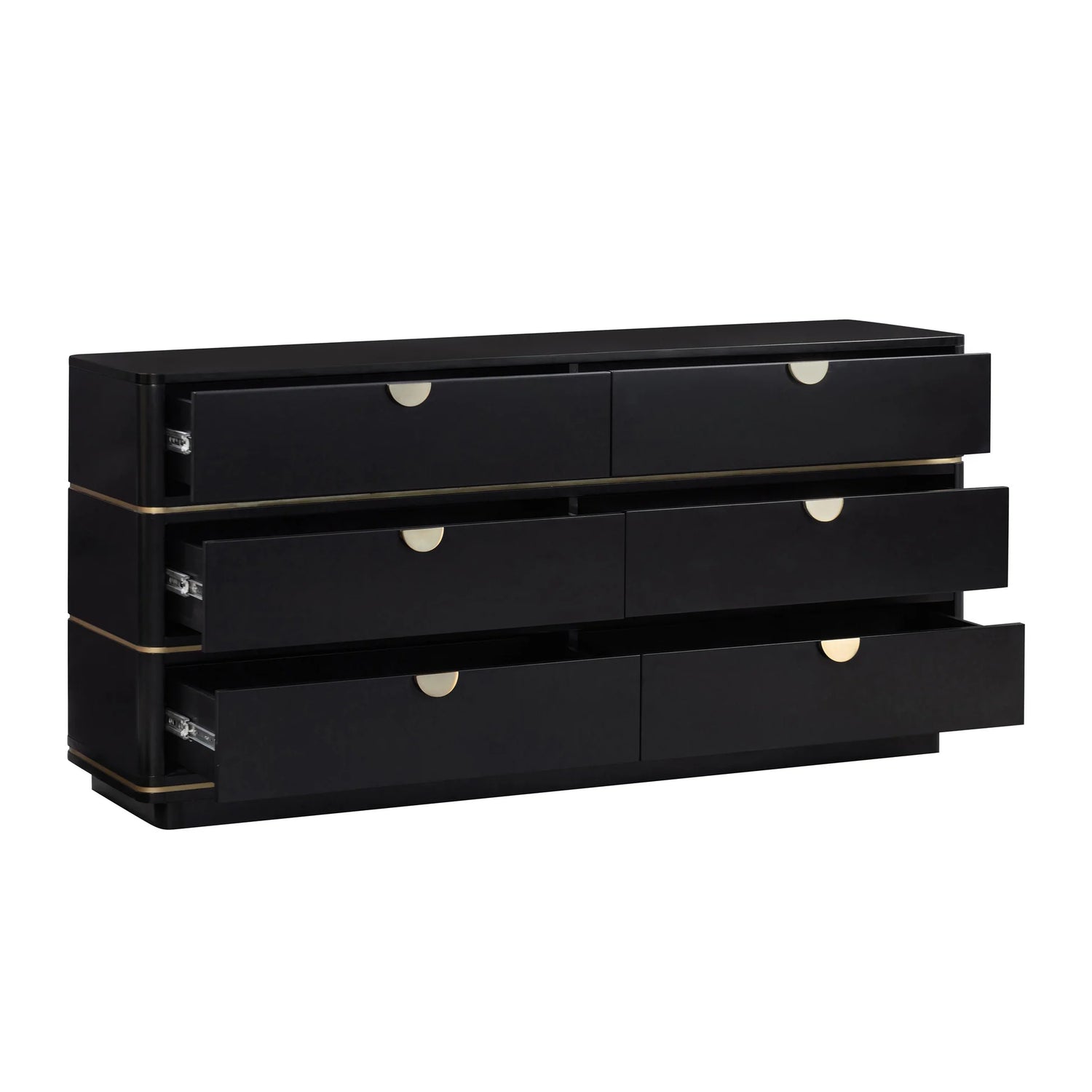 La cómoda Aine de 6 cajones es una obra maestra del Art Déco. Los espaciosos cajones con cierre suave ofrecen mucho espacio de almacenamiento y el material de madera de acacia garantiza una gran estabilidad. Aine agregará sin esfuerzo dramatismo y sofisticación a cualquier espacio.