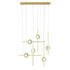 Varillas anodizadas de varios tamaños suspendidas verticalmente en acabados dorados. Cada varilla está equipada con una esfera de vidrio transparente que encaja perfectamente dentro de un anillo anodizado.