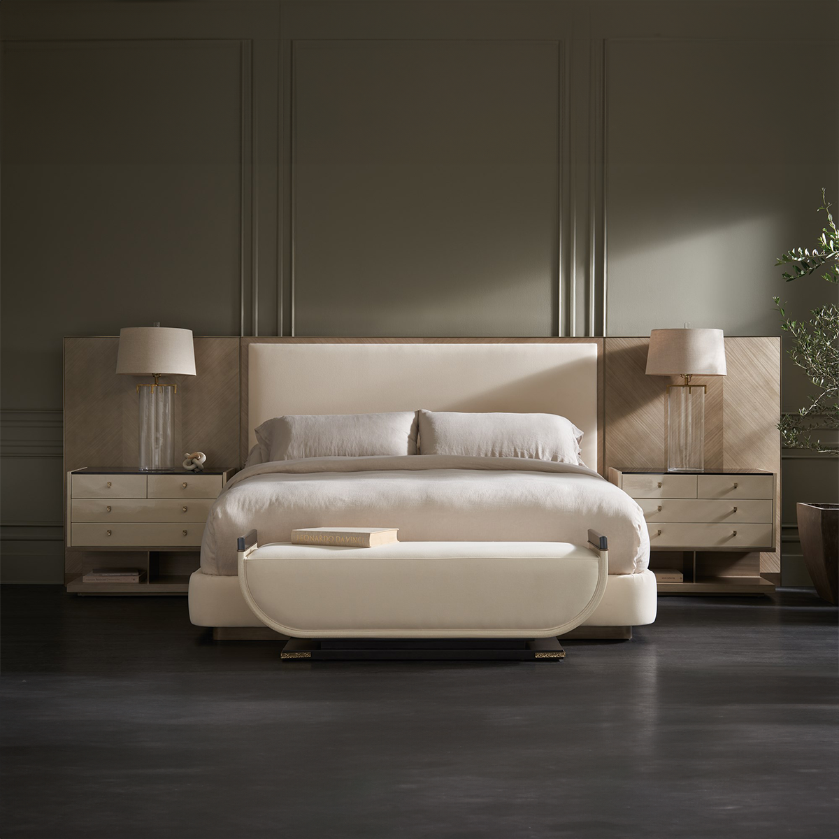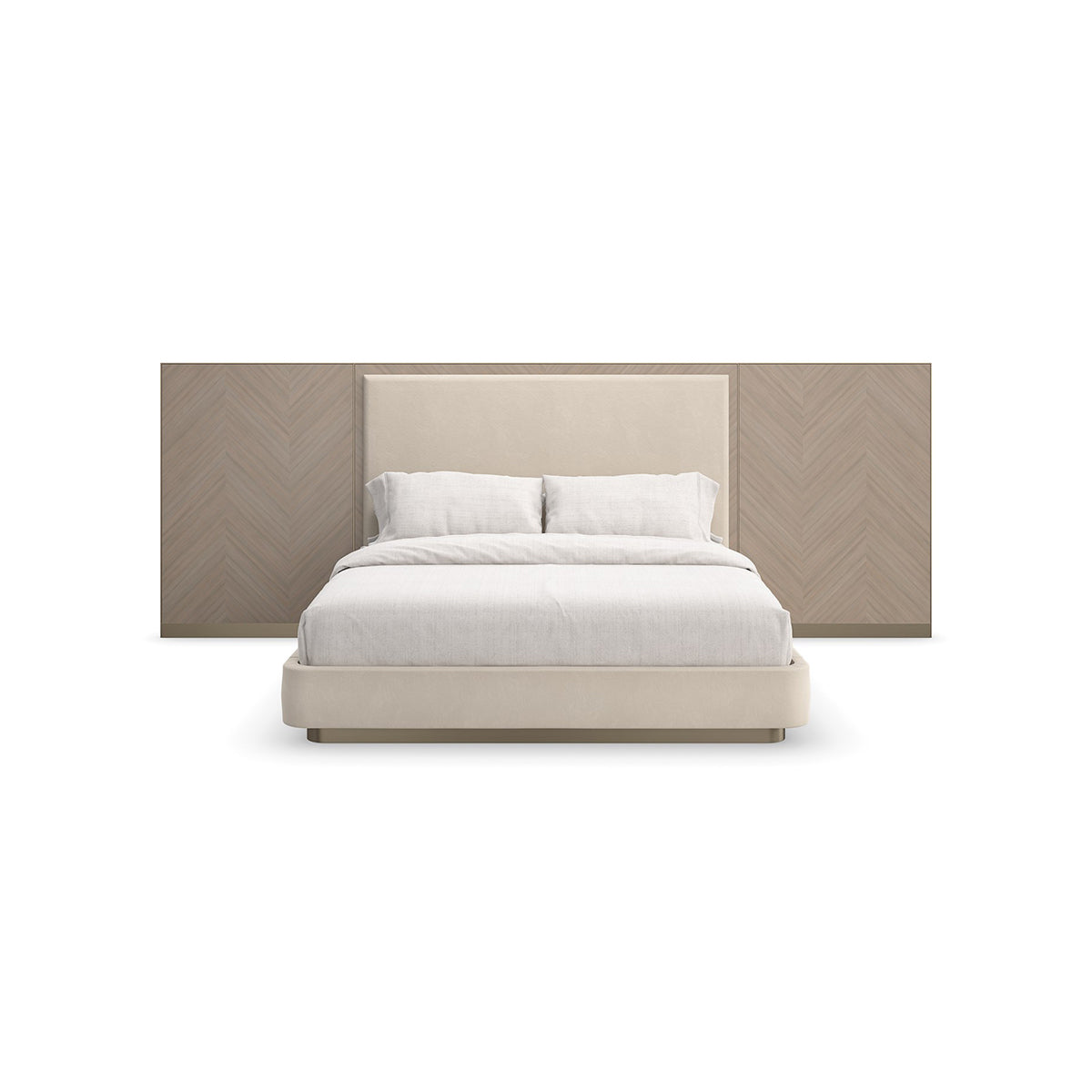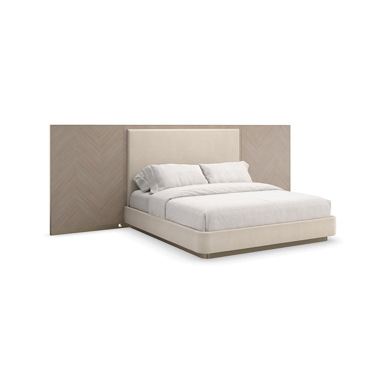 Esta cama clásica, es un colectivo histórico de materiales y formas, que presenta una paleta neutra relajante que es cálida y acogedora. Presenta alas con paneles en chapa de Koto con patrón. Cabecera estilo párroco vestida con una franela suave pero duradera similar a la lana. Una ranura de metal en Brushed Gold aporta separación y un toque de brillo. Su silueta sofisticada, que aparentemente flota sobre una base de zócalo de oro cepillado, aporta elegancia natural a los interiores de dormitorios y suites de invitados.