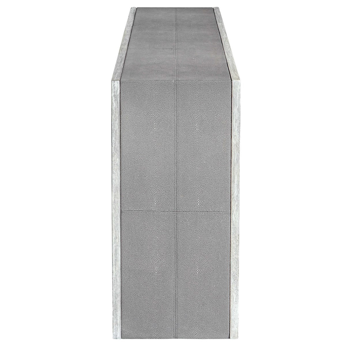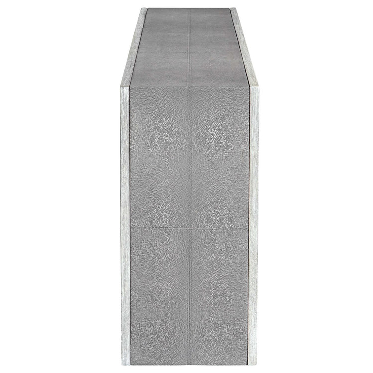 Con elementos modernos, esta consola de transición presenta paneles cosidos de imitación de shagreen gris claro, combinados con un acabado de madera contrastante en blanco envejecido con detalles desgastados en gris.