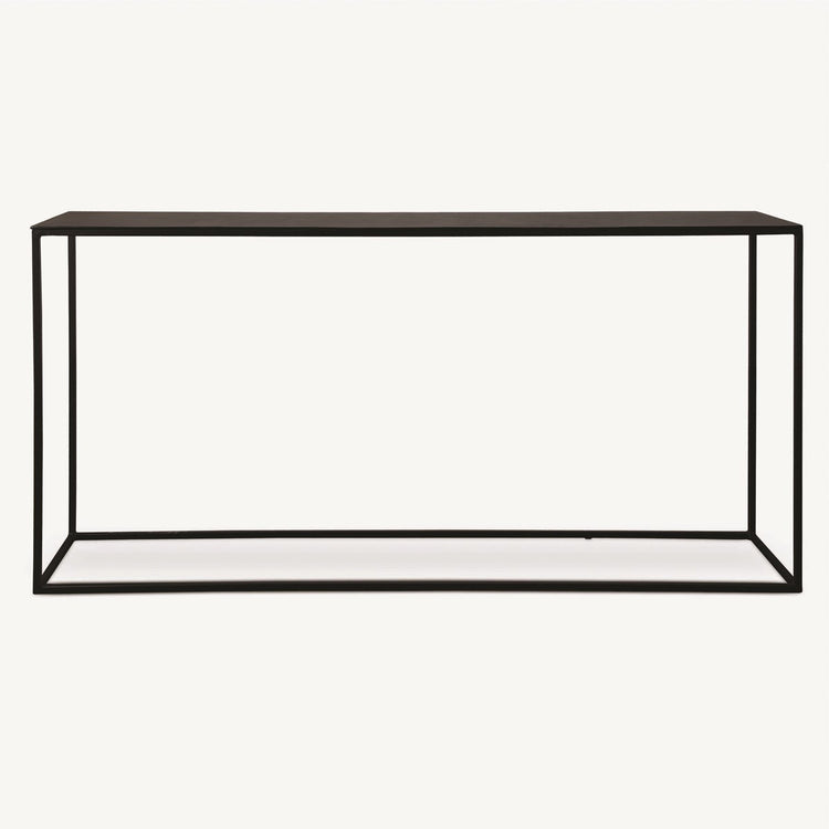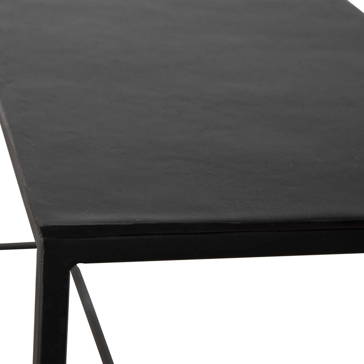Mesa consola de estilo industrial simplista, construida en hierro negro envejecido y con una tapa de losa de aluminio fundido texturizado con acabado en bronce antiguo chapado.