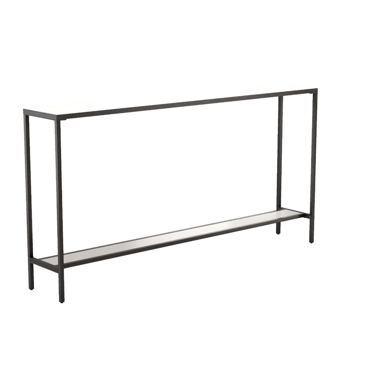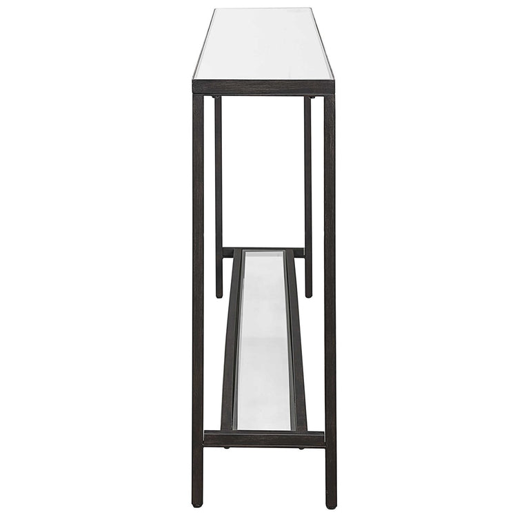 Clásica y minimalista, esta mesa consola estrecha de acero tiene un acabado en negro rústico estilizado, una parte superior con espejo biselado y un estante tipo galería en vidrio transparente.