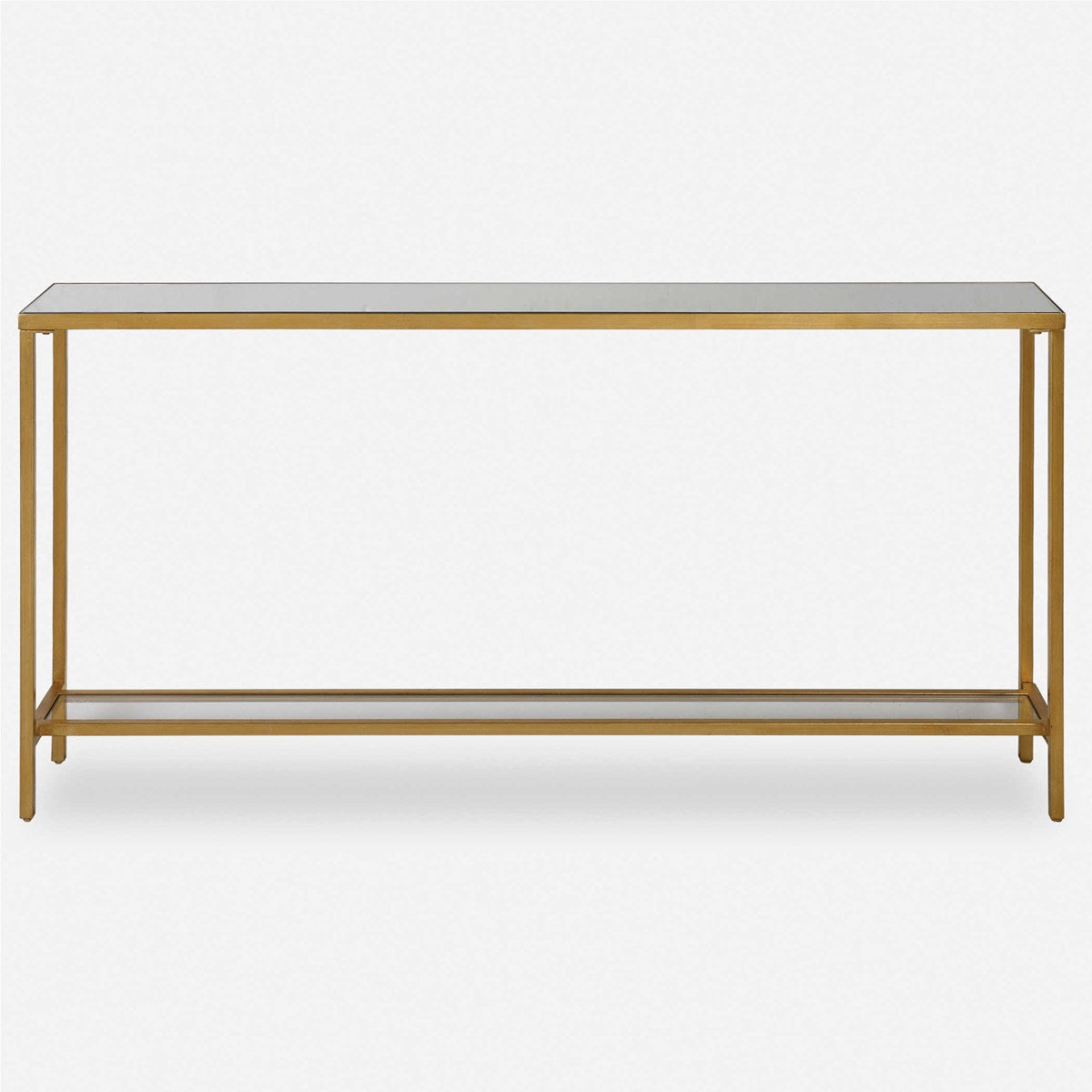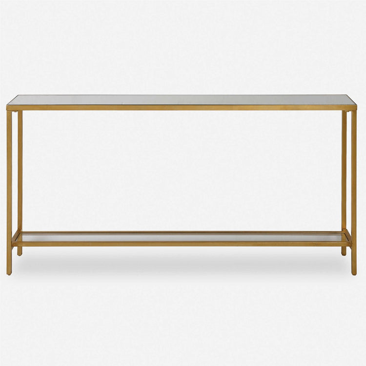 Clásica y minimalista, esta mesa consola estrecha de hierro tiene un acabado con pan de oro ligeramente envejecido, una tapa con espejo biselado y un estante tipo galería en vidrio transparente.