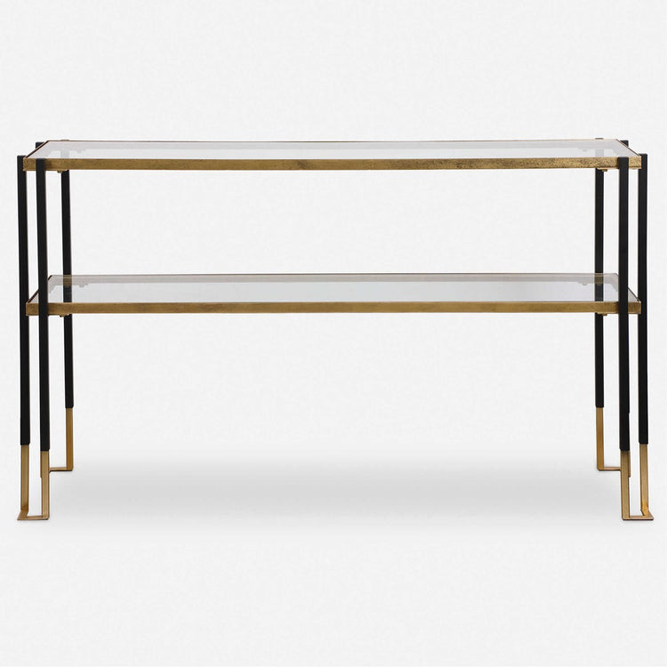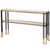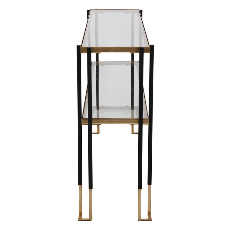 Con un marco de hierro macizo con líneas limpias, esta consola contemporánea tiene un acabado en dos tonos de negro mate y pan de oro. Tiene dos estantes de cristal templado.