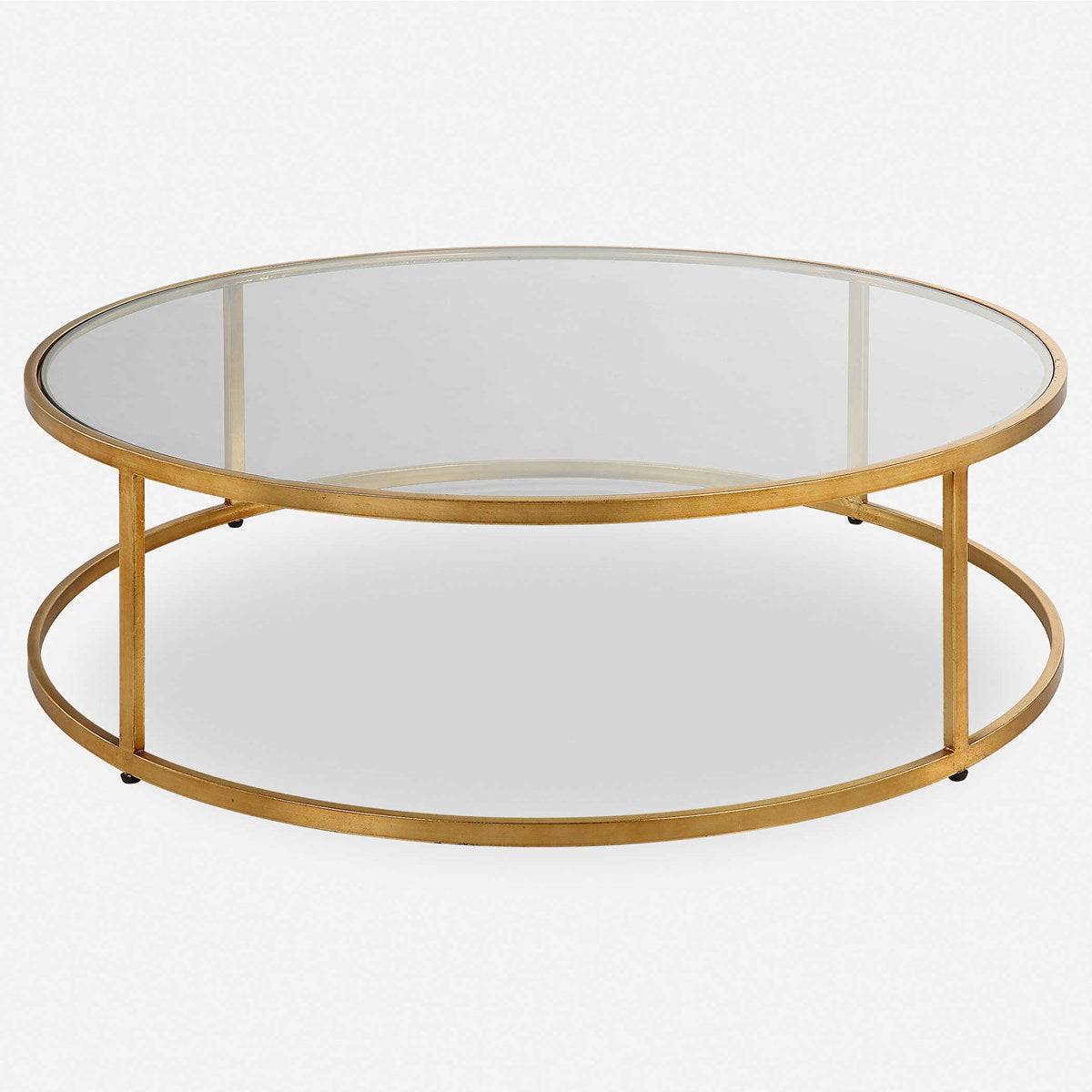 Un complemento para cualquier espacio moderno, la mesa de centro Aina presenta un marco de hierro con un acabado en oro ligeramente envejecido y una tapa de vidrio transparente.