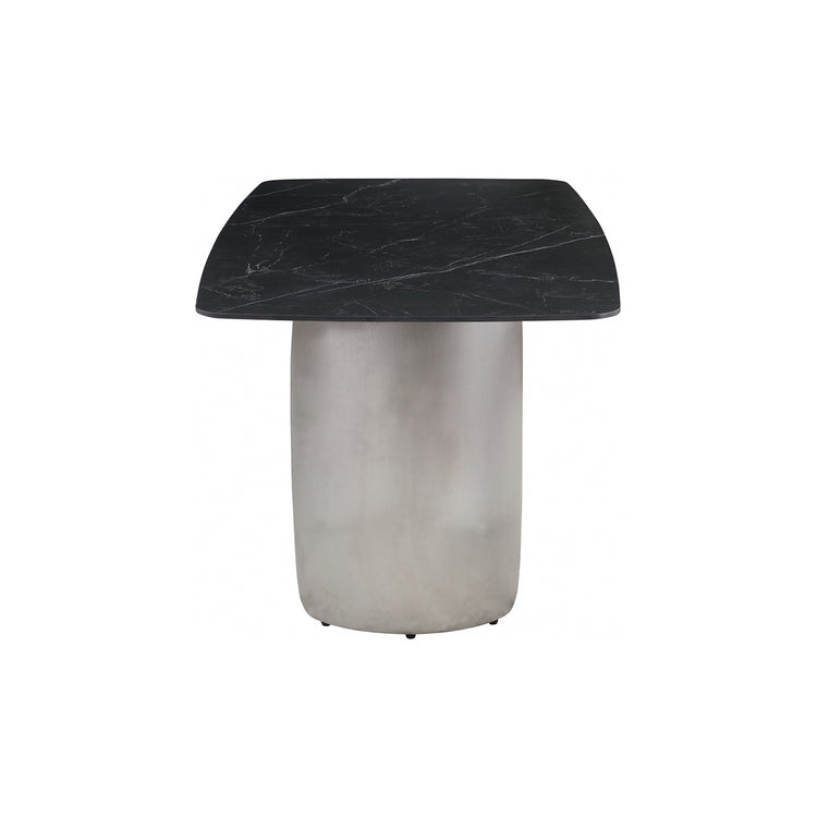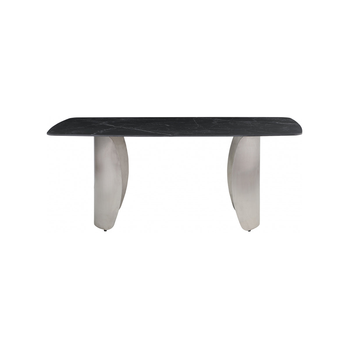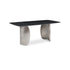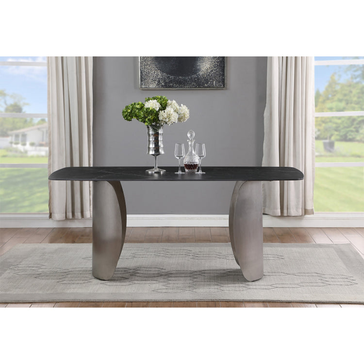 Haz  que las comidas más informales se conviertan  elegantes cuando los invitados se reúnan alrededor de esta mesa de comedor. Esta hermosa mesa es en parte arte y en parte imprescindible, con su elegante pero duradera cubierta de piedra sinterizada con apariencia de mármol negro y sus bases curvas en color silver cepillado.