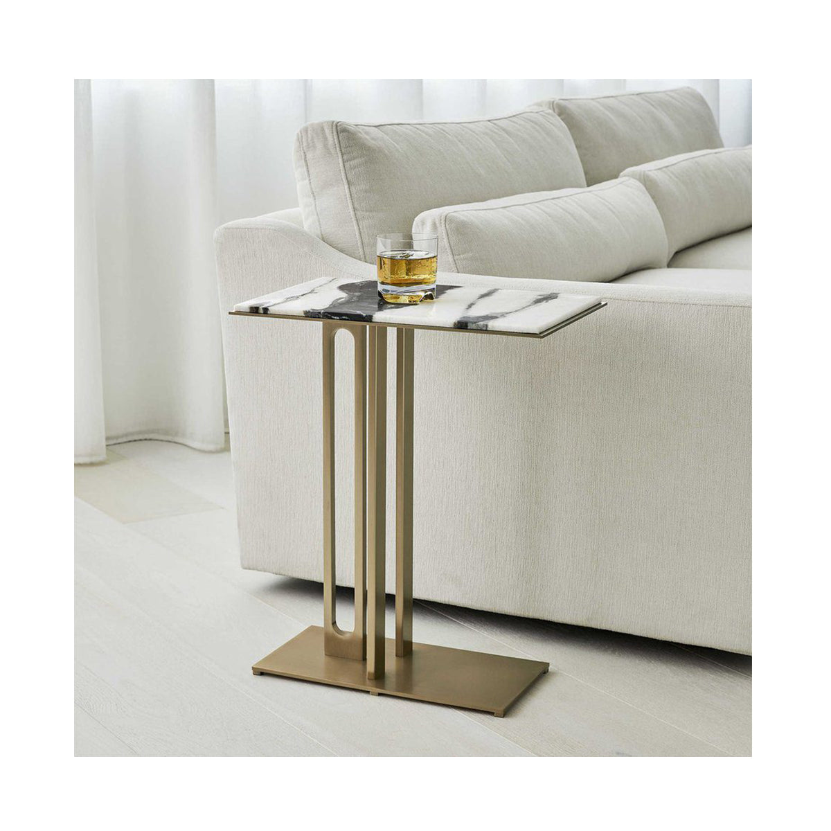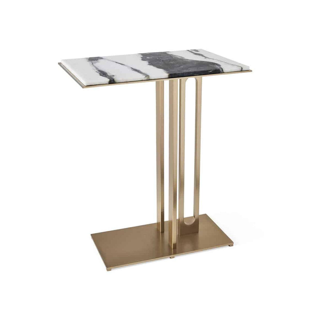 Un equilibrio entre función y belleza. El mármol Panda se asienta sobre una tapa, un cuerpo y una base de metal con un rico acabado en latón. Perfecto para parar en tu asiento favorito y descansar una copa.