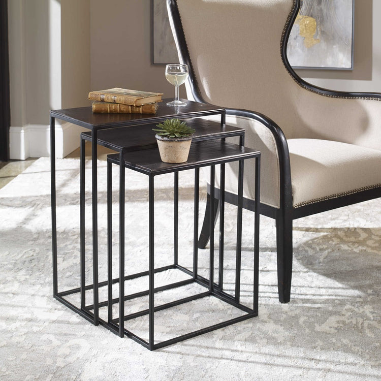 Mesas nido funcionales construidas en hierro negro envejecido, con una tapa de losa de aluminio fundido texturizado con acabado en bronce antiguo chapado.