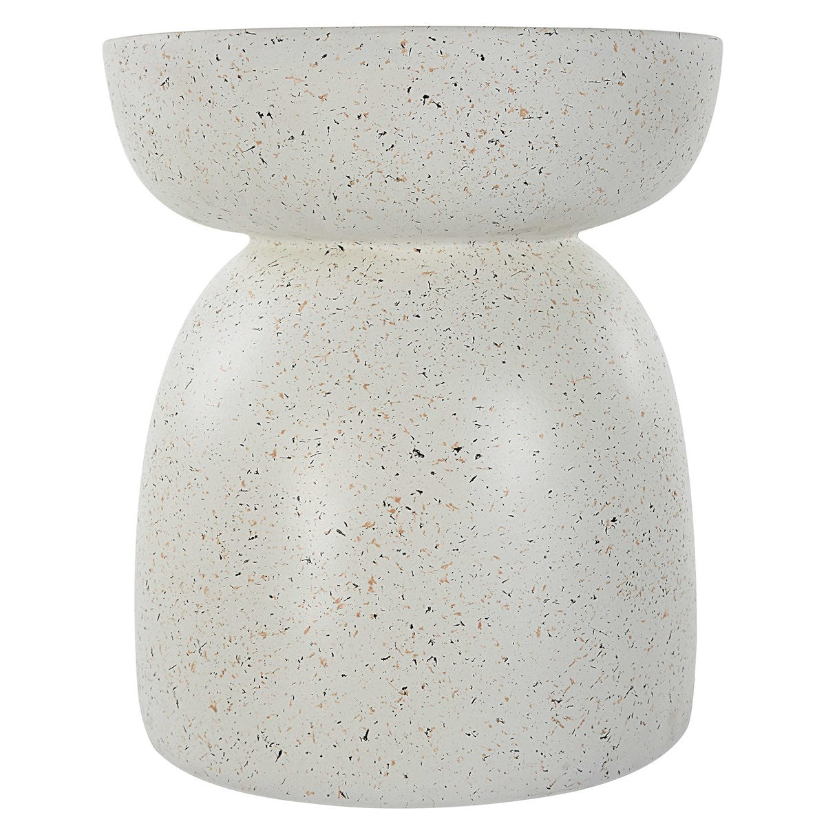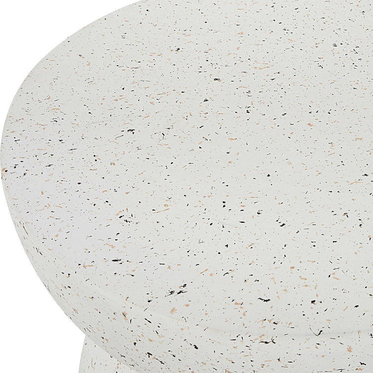 Una mesa decorativa refrescante formada a partir de resina fundida con un acabado blanco mate y toques sutiles de terrazo terroso.
