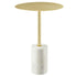 Deléitese con el elegante diseño de la mesa auxiliar. Con un tablero de hierro liso que combina armoniosamente con su barra de hierro a juego, esta mesa auxiliar irradia un encanto pulido. Anclando este diseño hay una base de mármol blanco en forma de cilindro de 8 pulgadas de alto.