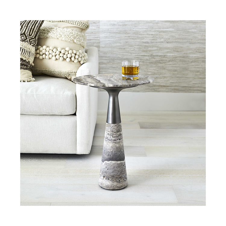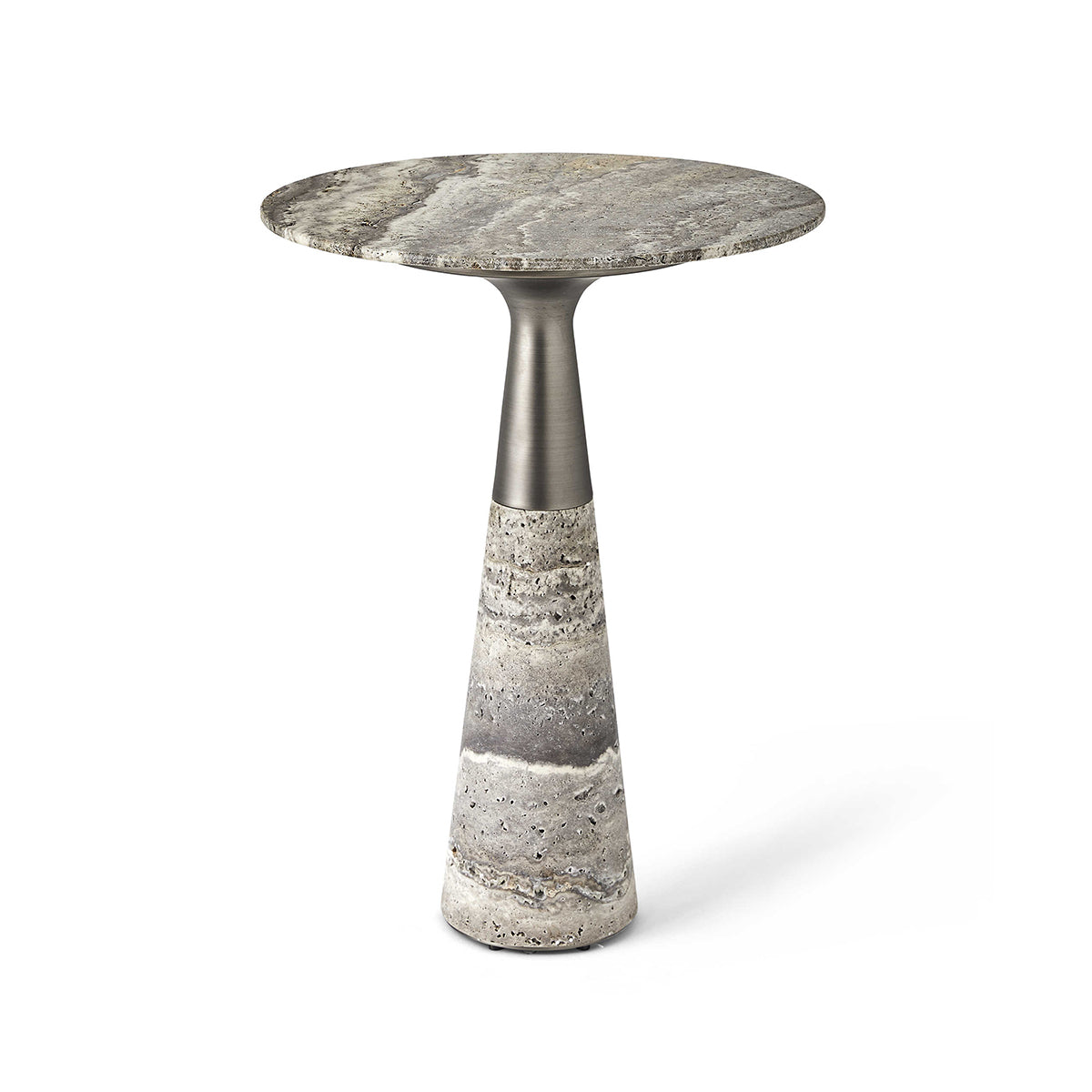 Un mástil de níquel oscuro cepillado sostiene una tapa de travertino gris de 16 pulgadas. La base redonda de travertino gris se estrecha suavemente para ocupar un espacio mínimo.