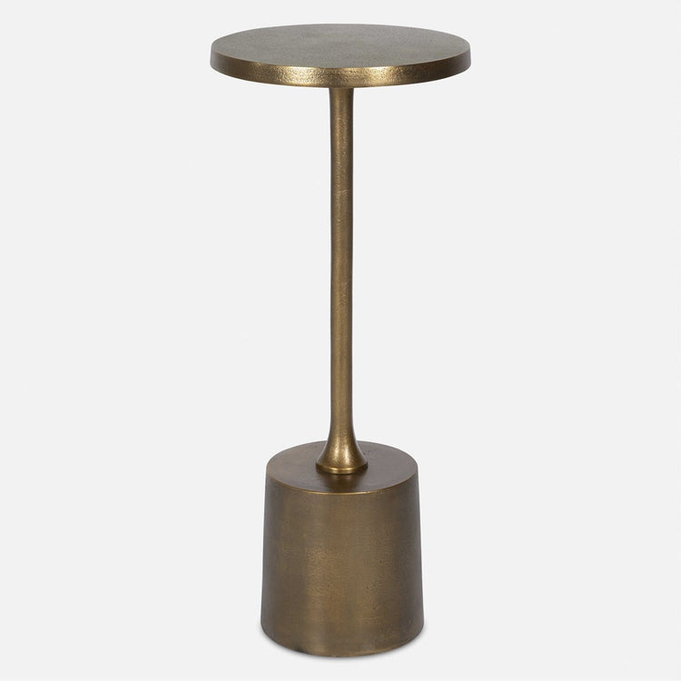 De estilo minimalista con una base gruesa, esta mesa para bebidas de aluminio macizo presenta un acabado texturizado en oro antiguo.