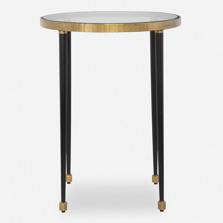 La mesa auxiliar Valeria ofrece un toque elegante a su sofá o silla. Construido en hierro con una parte superior con borde texturizado en oro antiguo con patas negras cónicas con pequeños detalles dorados. La parte superior es de cristal transparente.