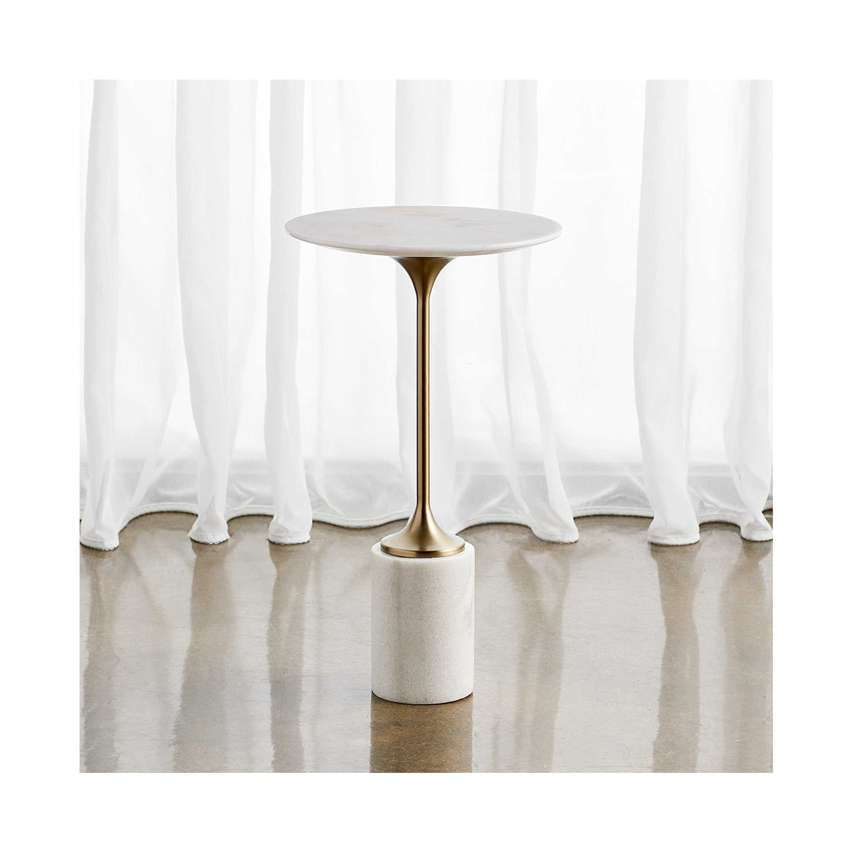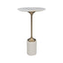 La mesa decorativa  está construida con un hermoso mármol blanco pulido con una base de metal estilizada con acabado de latón cepillado. Fiel a la naturaleza de los materiales naturales, cada pieza tendrá un veteado y vetas únicos en todas partes.