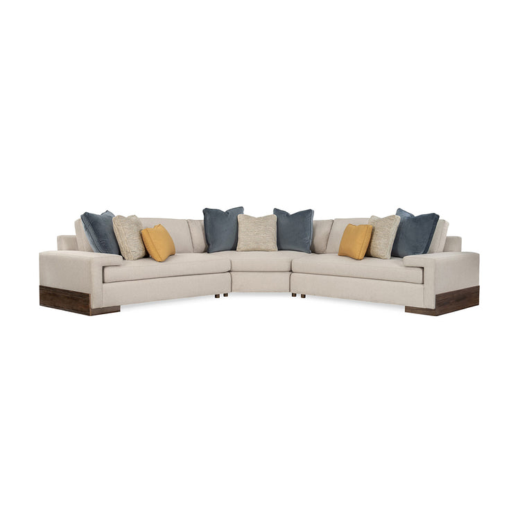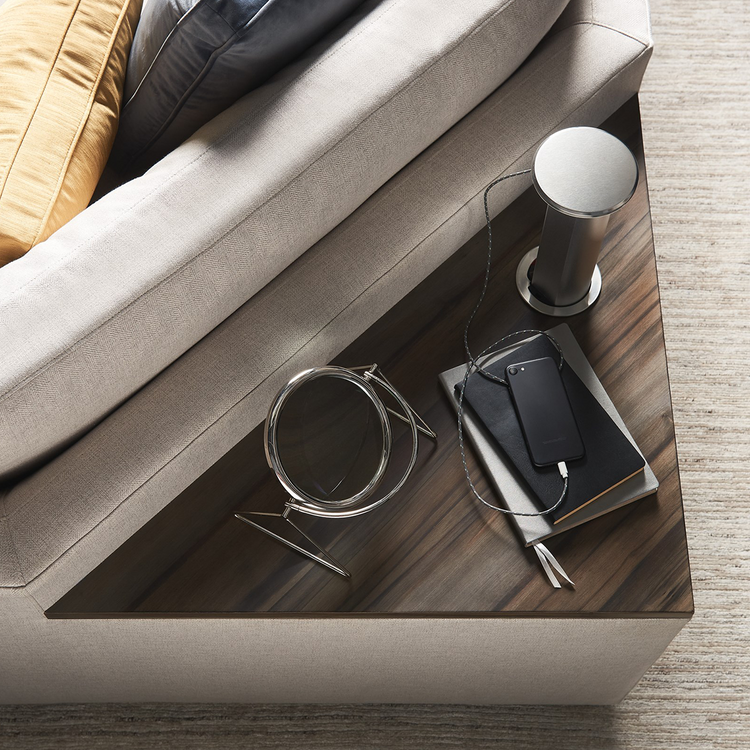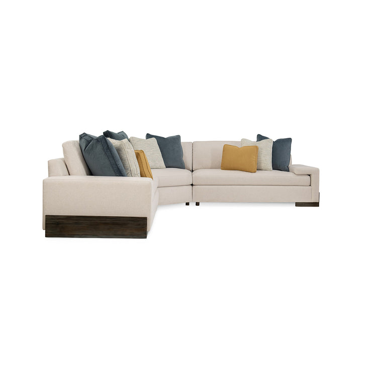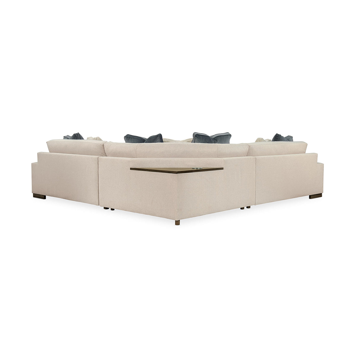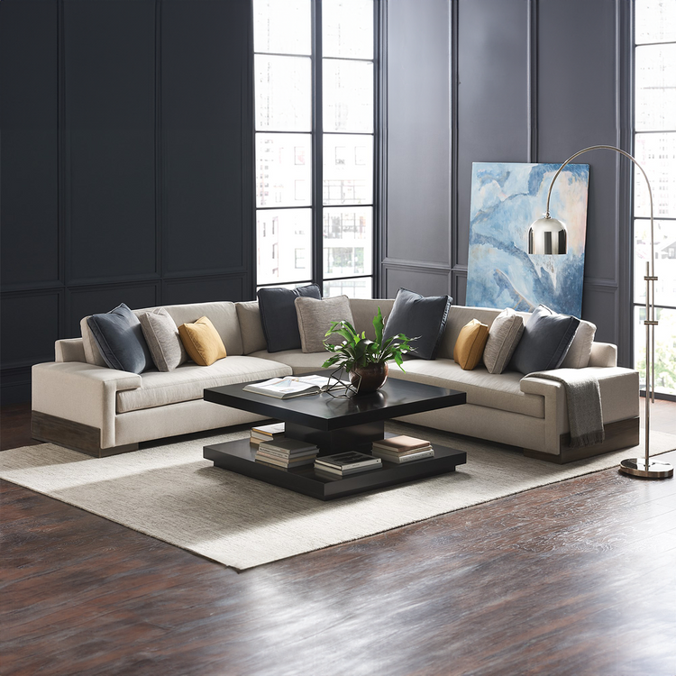 Cree un destino en su hogar con el carácter refinado y la comodidad de este impresionante sofá seccional. Único por su diseño, sus cojines de asiento se ubican debajo de un amplio brazo de estante creando un estilo llamativo. Una cuña central cuidadosamente diseñada cuenta con un estante de madera con acabado en Smoked Sable que proporciona un lugar para refrigerios y bebidas al mismo tiempo que oculta una ventana emergente con enchufes de carga multinacionales de CA y USB. Destinado a ser un lugar favorito para descansar y relajarse, este mueble modular está tapizado en una tela neutra similar al lino con un pequeño y moderno diseño en espiga. Los almohadones decorativos en tonos pizarra y vara de oro añaden impacto y estilo. Una base angular de madera Fumed Gum con acabado en Smoked Sable sostiene el marco e imparte un toque final que fundamenta su presencia de diseño.