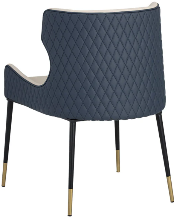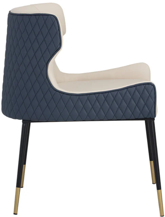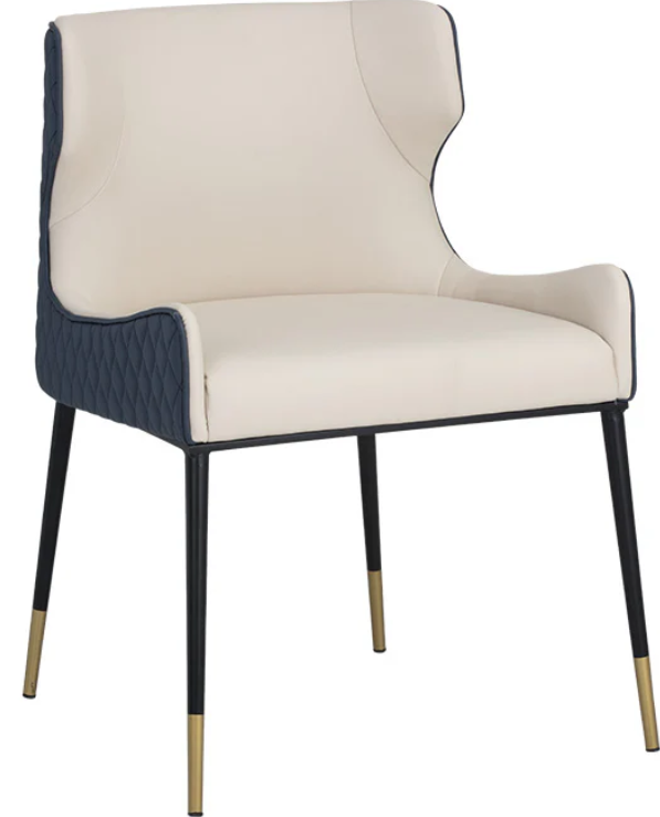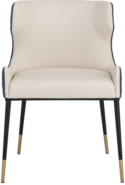 Una silla de comedor clásica con un asiento sustancial tapizado en piel sintética en color crema dillon y trueno en contraste. Las costuras de diamantes en el respaldo agregan un toque de elegancia, mientras que las patas de madera negra y las tapas de los pies en oro cepillado completan la apariencia.