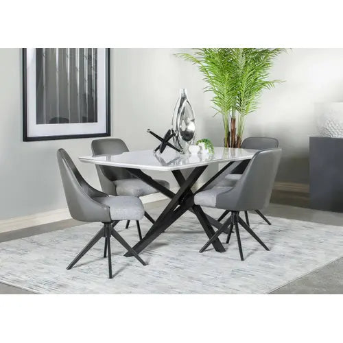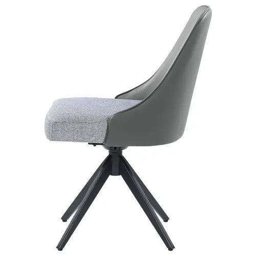 Las influencias de inspiración retro elevan esta moderna silla de comedor a un divertido asiento junto a la mesa. Diseñado como una silla giratoria, tanto los adultos como los niños apreciarán este mueble conversacional, que gira para rellenar bebidas y charlar con los invitados. Con un asiento tipo cubo, esta silla tapizada está tapizada con una suave polipiel gris en el respaldo y una tela texturizada de color gris claro en el asiento para lograr un efecto de dos tonos.