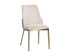 Haz una declaración audaz con esta silla de comedor moderna llena de detalles lujosos. Tapizada en tela Belfast color oatmeal con un acento en la parte posterior en piel sintética Bravo cream color cognac. Terminada con patas de acero cepillado en acabado latón antiguo.