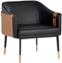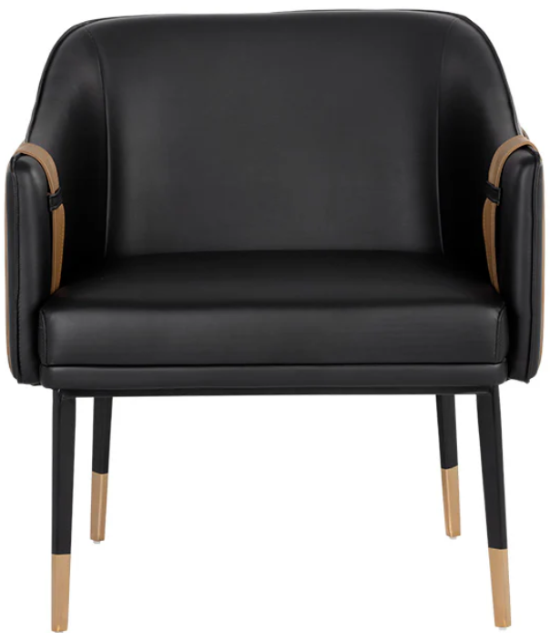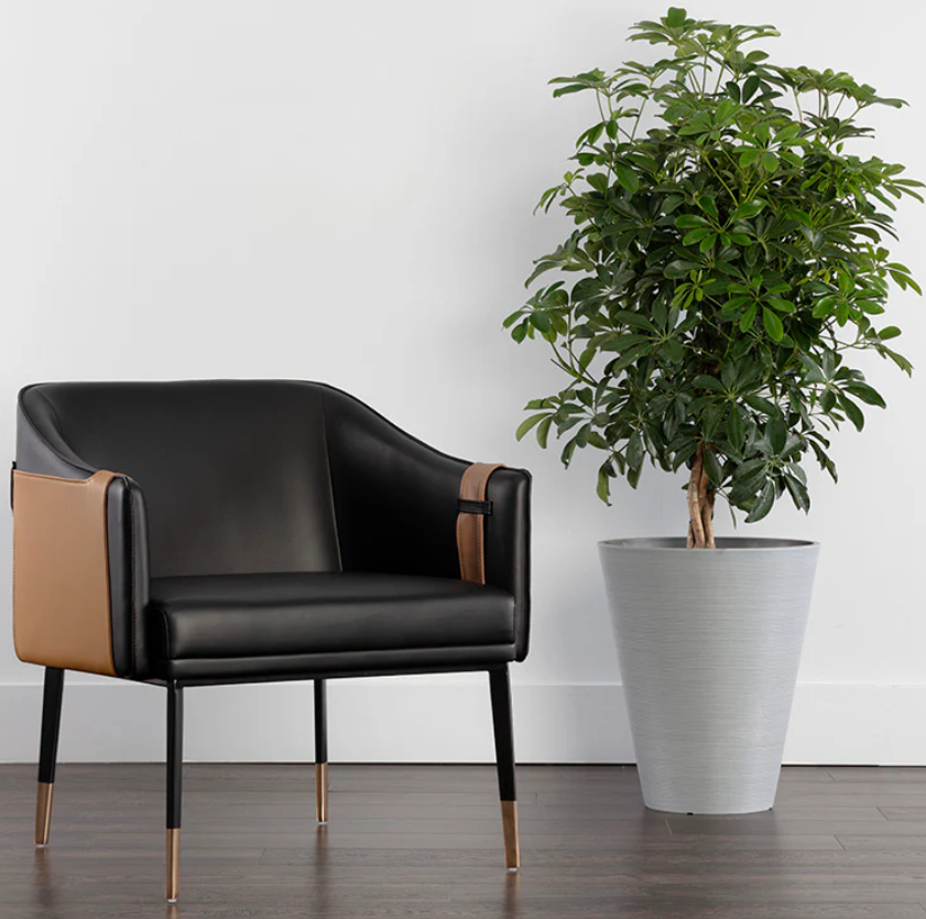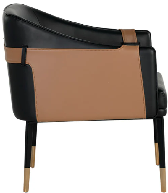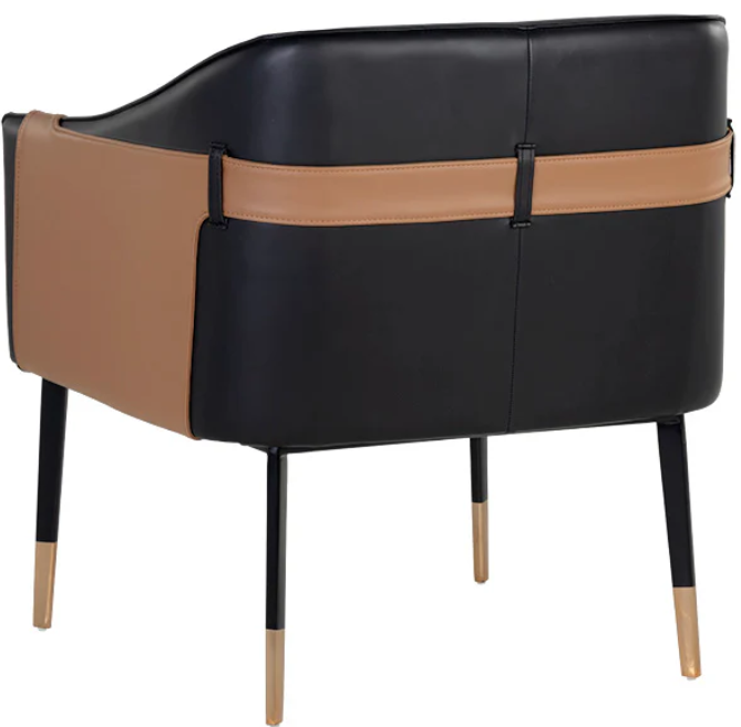 Un exclusivo sillón con respaldo de barril tapizado en suave piel sintética de color negro napa y acentuado con un exterior contrastante en piel sintética de napa color coñac. Acabado con patas de acero negro y tapas de cobre. Apto para espacios residenciales y comerciales.
