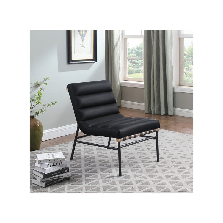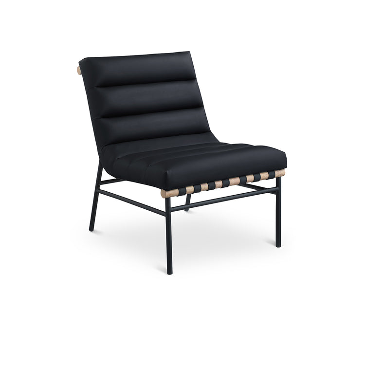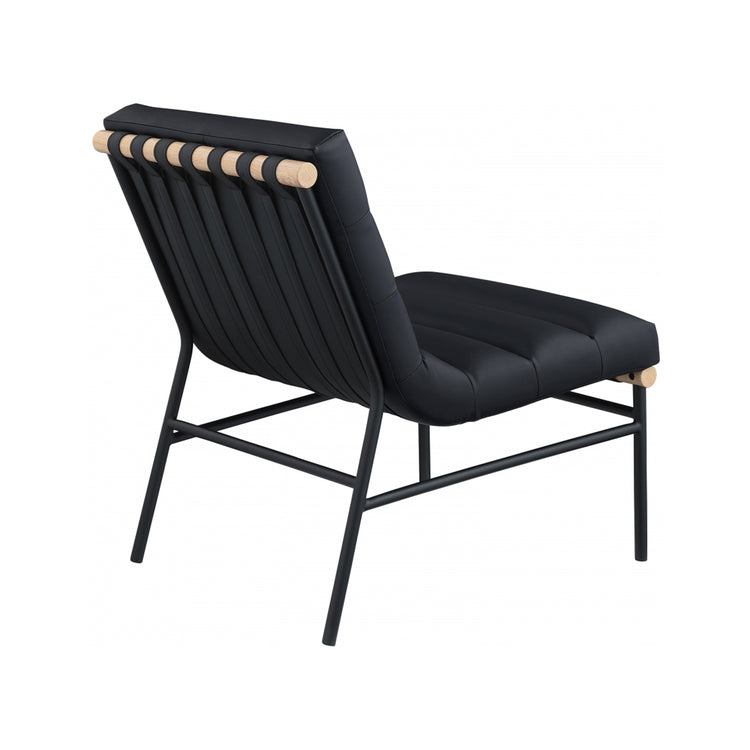 Esta llamativa silla tiene un ambiente súper relajado con su diseño sin brazos y su respaldo ligeramente reclinado. El suave cuero vegano negro se siente muy bien contra la piel y brinda la apariencia del cuero sin costo alguno.