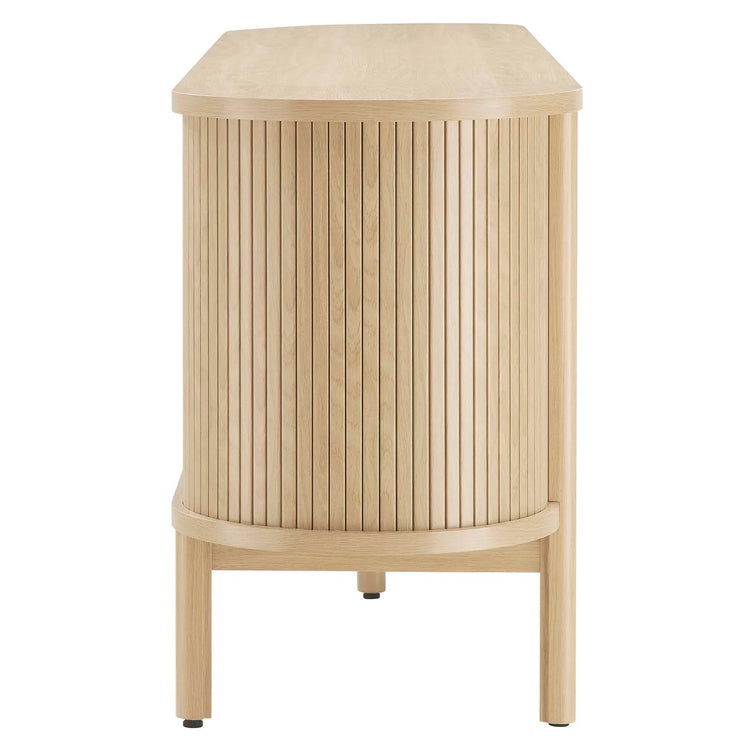 Revolucione la decoración de su sala de estar con el soporte para TV Corina de 71 pulgadas. Este moderno mueble para televisión de mediados de siglo presenta un diseño único con bordes curvos y detalles acanalados, lo que lo convierte en un complemento elegante para los muebles de su sala de estar. Construido con materiales de alta calidad como madera de caucho, tableros de partículas y MDF, este soporte multimedia duradero cuenta con un hermoso laminado de vetas de madera que aporta una estética orgánica a su sala de estar o sala de estar.