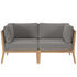 Disfrute del clima cálido mientras descansa en la colección de muebles de patio para exteriores. Este sofá de dos plazas para exteriores, que aporta una estética contemporánea a un patio trasero, porche, patio, terraza o junto a la piscina, cuenta con correas de cuerda tejida debajo de los cojines acolchados de espuma que otorgan un encanto costero y ventoso.