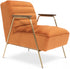 Vuélvete moderno en tu sala, estudio u otro espacio con esta silla decorativa de terciopelo. El respaldo y el asiento tienen mechones de canal para mayor resistencia y belleza duradera. La estructura de metal agrega una calidad duradera a esta silla, y las patas de metal dorado cepillado y los brazos de madera le dan un ambiente contemporáneo definitivo.